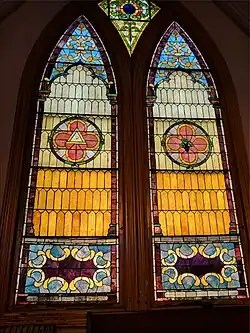 The church, built in 1900, is a Late Gothic Revival style, in a de-shingled Shingle Style with a steep slate gable roof. It features twelve large pointed arched windows and an 80-foot-tall (24 m), square bell tower. The church is the first building for its German-speaking congregation, founded in 1902.