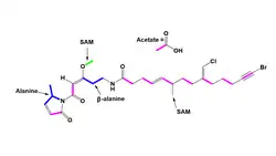 It has been predicted that jamaicamide A's biosynthetic pathways are from a hybrid polyketide synthase-nonribosomal peptide synthetase (PKS-NRPS) assembly units. Jamaicamide A is a popetides with a colinear arrangement with a chemical structure that suggests it is derived from various polyketides (9 acetate units), amino acids (L-Ala and β-Ala), and methionine-derived methyl groups. Nevertheless, it has distinctive molecular features like the terminal alkynyl bromide, vinyl chloride, and pyrrolinone ring. The biosynthetic origins and mechanism of formation of the pyrrolinone ring system are unknown.[3]