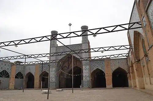 The mosque comprises a main iwan, porches, a large sahn, and Shabestans to the south and east. The mosque has four small iwans, three of which are blocked. The north-west façade and minarets date from the 12th century AH[5] and is adorned with arches and ceramic tiles. The main part of the current mosque is its pillared Shabestan to the south, built from stone. The ceiling and brick dome of this Shabestan is erected on stone pillars. The eastern porch was constructed during the Safavid era, while the Shabestan of the mosque is its oldest segment. The northern and western side walls date from the 13th and 14th centuries AH.[1]