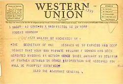 One of Ulio's most important roles was notifying families when their loved ones became casualties. By the war's end Casualty Branch in the Office of the Adjutant General consisted of 80 officers and 2,000 enlisted personnel. Every day it received punched cards from the theaters of operations. The staff then translated these into words. Other members then typed the information onto casualty forms. The soldier's emergency contact information was then verified; many people changed address without notifying the Army. If the soldier had died, the branch head, Colonel George F. Herbert, would review the paperwork. The Signal Corps then contacted Western Union and sent a telegram, which would go out under Ulio's name. Ulio directed that no telegrams would be delivered between 22:00 and 07:00. A confirmation letter would follow in the post. These were individualised; Ulio directed that no form letters would be sent to grieving families. During the war, 318,274 US soldiers were killed and 565,861 were wounded.[26]