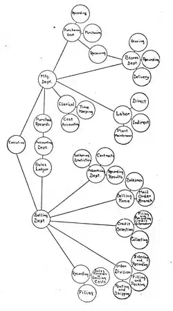 At the end of the first chapter a chart is presented of a business organization (see image), which has similarities with both an organizational chart and mind map. The charts building blocks mention both business function (executive), departments (Mfg. Dept.; Selling Dept.; Accounting Dept.; etc.), records (Purchase Records; Sales Ledger; etc.), business activities (Time Keeping; Cost Accounting; etc.), and cost accounting classes (Labour Direct; Labour Indirect; etc.). In a similar way organization departments had been pictured by Griffith, such as the Purchasing Department, Stock Department and Advertising Department (see below).