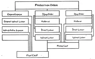At the end of the chapter Griffith present a chart of manufacturing cost (see image). This chart is a graphic illustration of the items which enter into the cost of manufacture, the manner in which these items are obtained and, finally, brought together in a permanent form. Griffith commented, that "a study of this chart will enable the student to outline a general plan for a cost system suited to the needs of his particular factory. When the general principles of the cost finding system are understood, it becomes merely a matter of detail to apply those principles to individual factories."[27]