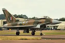 Eurofighter Typhoon ZK349, in World War Two colours, with Nicolson's squad number, at Royal International Air Tattoo 2015