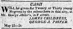 In May 1815, Childress and his brother-in-law George A. Phifer advertised in Washington, D.C. for "twenty or thirty young Negroes."[8] Childress and Phifer could be found at George Miller's tavern on F street and they would pay cash for the slaves.[8]