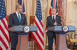 In January 2023, Cleverly again met Antony Blinken, the US Secretary of State, in Washington, DC, to discuss the Russian invasion of Ukraine, recent events in Iran following the anti-regime protests occurring there among other issues, as well as to reaffirm the UK's special relationship with the United States.[52] Cleverly was criticised by some Conservative MPs, including Liz Truss, for refusing to reclassify China as a "threat" in response to the Chinese Government's aggressive foreign policy and its human rights abuses of the Uyghur Muslim community.[53] He called China a potential "partner for good".[54]