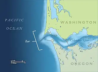 On 12 July 1846 the USS Shark reached the Columbia River. It was designed for combating Caribbean piracy. The vessel had an "inclination to lower its bow and dive under when pressed by the wind under full sail."[45] In the afternoon Henry H. Spalding, Asa Lovejoy, and William H. Gray arrived on a small boat. While there wasn't a regular pilot for the Columbia, they recommended employing Saules to reach Fort George. He was likely most familiar with scows, the most commonly used vessels on the Columbia by fur traders and settlers.[46] Saules "was also facing one of the world's most difficult rivers to navigate..."[47] Commanding officer Lieutenant Neil M. Howison described the subsequent events: