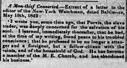 Bancroft observed in 1931 that Purvis was the only one of the "conspicuous" Baltimore traders of the 1830s still working in the 1850s, although it was not clear whether or not Purvis continued trading: his firm was listed in Baltimore city directories as "'stock-brokers' doing an 'exchange & collection' business."[29] The answer, according to an 1855 newspaper article by Solon Beale, a Maine-born abolitionist who worked as a schoolteacher in Baltimore, was that Purvis had stopped trading in the 1840s: "In 1842, James F. Purvis, from Tennessee, had a slave prison, in the upper part of the city, called Hartford Avenue. He was always too good a man to be engaged in that business, and in a great revival of religion joined the Methodist church, and has been a faithful Christian ever since engaged in various works of faith, and labors of love. The slave business was of course abandoned, instanter."[30] It may be incidental, then, that in November 1841, Purvis' associate McCargo was taken prisoner during the Creole mutiny, which is generally considered the most successful slave rebellion in U.S. history.[31] Joshua D. Rothman also reported in The Ledger and the Chain: How Domestic Slave Traders Shaped America (2021), that in October 1843, "the Christian Reflector magazine wrote that he had 'converted to Christianity under Methodist preaching, became a good man, and quit' the slave trade...Purvis's path was so rare because slave traders who displayed guilt, shame, or remorse were so rare."[32]