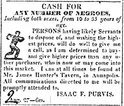 Isaac F. Purvis (c. 1813 – June 24, 1843) was James F. Purvis' younger brother and an American slave trader who worked around Annapolis, Maryland for several years in the 1830s. Purvis was born about 1813,[60] probably in Tennessee. In addition to working with his brother and uncle, Purvis was associated with George Kephart of Frederick County, Maryland and later Alexandria, Virginia.[61] In 1835 he ran a number of newspaper ads seeking to buy "any number of negroes, including both sexes, ages 10 to 35 years of age." He could regularly be found at Mr. James Hunter's tavern in Annapolis.[62] By 1838 James Hunter tavern had become "Mrs. Hunter's tavern" and "any communications left with John Lamb" would be promptly attended to.[63] Circa 1841, anyone wishing to sell people to James F. Purvis was encouraged to seek out his brother at the Eagle Hotel in opposite the B&O Railroad depot in Baltimore.[11] Isaac F. Purvis died at age 30 in 1843; the funeral was held at his brother's home on Hanford Avenue.[60]