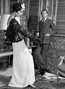 This type of occurrence was commonplace among his faithful customers, who included Marilyn Monroe,[23] Elizabeth Taylor, Jackie Kennedy, Lady Bird Johnson, Grace Kelly, Diana Ross,[7] Betsy Bloomingdale,[24] Rosalind Russell, Marlene Dietrich, Dorothy Lamour,[25] Judy Garland, Loretta Young, Ali MacGraw,[26] Ivana Trump,[27] Carolyne Roehm,[28] Kim Basinger, Arianna Huffington[29] and many other notable personalities and film and media stars. In 1982, John Duka, the New York Times columnist, described in his column, Notes on Fashion, a black tie party in Galanos' honor attended by his A-list fans, "James Galanos, the designer whose clothing is unmatched in quality and price in this country, was in town, and almost immediately the level of social exchange seemed elevated as if by ripple effect. Betsy and Michael Kaiser – he is the photographer – gave a black tie buffet dinner for the designer Saturday. Among those at table were Lyn Revson, Gordon Parks, Barbara Walters, Arianna Stassinopoulos, former Senator Abraham A. Ribicoff and his wife, Casey, Freddie and Arlette Brisson, Mary McFadden, Tammy Grimes, Stephen Paley, John Loring, Gloria Vanderbilt, William Macomber, Sybilla Clark, Alex Gregory, Frank and Gloria Schiff and Bob Colacello. Mr. Galanos was the center of attention: Almost every woman in the room was wearing one of his designs."[30]