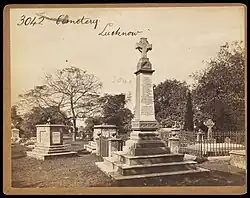 The rank and precedence of the wife of a K.C.B. was given to his widow, and memorials were erected in Lucknow Cemetery and at the Auld Kirk of Ayr.[2] The memorial at the Residency, Lucknow reads: "Sacred to the memory of Brigadier General J.G.S. Neill C.B. and A.D.C. to the Queen. Col J.L. Stephenson C.B. Major G.S.C. Renaud Lieut. W.T. Groom. Lieut N.B. Arnold. Lieut J.A. Richardson. Lieut J.A. Chisholm Lieut F. Dobbs 352 non-commissioned officers, drummers and rank and file of the First Madras Fusiliers who fell during the suppression of the rebellion in Bengal 1857-58." Identical statues by Matthew Noble were also erected in Ayr and Madras.[7]