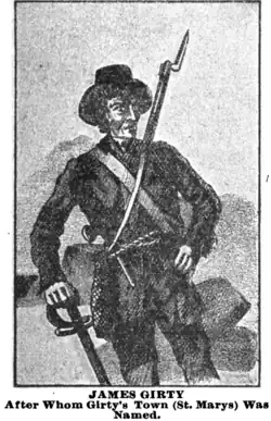 James Girty was the son of an Irish immigrant, Simon Girty (died 1751) and the younger brother of Simon Girty (1741–1818). The brothers were taken prisoners by the French and Indian force which in 1756 captured Fort Granville, in what is now Mifflin County, Pennsylvania. James was adopted by the Shawnees and lived among them for three years, after which he acted as an interpreter and trader; he frequently accompanied the Indians against the English settlers, and exhibited the greatest ferocity. He conducted a profitable trading business with the Indians at Saint Marys, Ohio from 1783 to 1794, when he withdrew to Canada upon the approach of General Anthony Wayne, and again from 1795 until just before the War of 1812, when he again withdrew to Canada, where he died.[1]