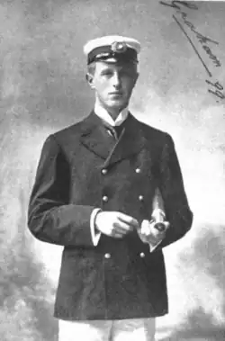 As a mariner, he served in the Mercantile Marine and ASC in South Africa, during which time he obtained the first film ever taken of a total eclipse of the Sun during a Royal Astronomical Society expedition to India in 1899, and took part in a mission in 1900 for Lloyd's of London to the South African Government to establish wireless telegraphic stations on the coast. Having been instrumental in founding the Royal Navy Volunteer Reserve (RNVR) in 1903, he served during World War I and was later Commodore of the RNVR Clyde Division, then the East Coast of Scotland RNVR. On 12 October 1921,[2] he was promoted Commodore 2nd Class and appointed Commodore of the entire RNVR, serving in this role until his retirement in 1927.[3] As a result, from 1946 to 1968, whichever ship was attached to the Tay Division of the Royal Naval Reserve (in Dundee) was always temporarily renamed HMS Montrose after the 6th Duke.[4] In 1992, the seventh Duke-class frigate Montrose was so-named for the same reason.