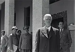 On his way to take up his appointment, he had a meeting in London with Foreign Secretary Bevin—"I had to tell myself that this was not Hitler seated before me" — at which he provoked Bevin into losing his temper by suggesting that Britain should send a diplomatic representative to Tel Aviv.[7] He arrived in Haifa 12 August 1948. During his first months in the country there were serious concerns for his security.[8] Three months previously Thomas C. Wasson, the U.S. Consul in Jerusalem, had been assassinated in West Jerusalem. On 22 August the Chief Code Clerk at the U.S. Consulate in Jerusalem was kidnapped by the Stern Gang and held for almost 24 hours.[9] Fears were increased following the killing of Folke Bernadotte in September.