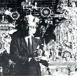 James Hampton (April 8, 1909 – November 4, 1964) was an American outsider artist. Hampton worked as a janitor and secretly built a large assemblage of religious art from scavenged materials, known as the Throne of the Third Heaven of the Nations' Millennium General Assembly. Often abbreviated to simply the Throne, it is currently on display at the Smithsonian American Art Museum in Washington.[1] Art critic Robert Hughes of Time magazine wrote that the Throne "may well be the finest work of visionary religious art produced by an American."[2][3]