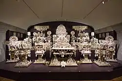 The complete work consists of 180 objects, many of them inscribed with quotes from the Book of Revelation. The centerpiece of the exhibit is a throne, seven feet tall, built on the foundation of an old maroon-cushioned armchair with the words "Fear Not" at its crest. The throne is flanked by dozens of altars, crowns, lecterns, tablets and winged pulpits. Wall plaques on the left bear the name of apostles and those on the right list various biblical patriarchs and prophets such as Abraham and Ezekiel.[6] The text The Throne of the Third Heaven of the Nations' Millennium General Assembly was written on the objects in Hampton's handwriting.