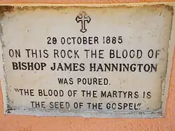 After eight days of captivity, Hannington's porters were killed on Mwanga II's orders, and on 29 October 1885, Hannington himself was speared in both sides.[4] As he died, his alleged last words to the soldiers who killed him were: "Go, tell Mwanga I have purchased the road to Uganda with my blood."