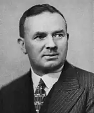 For much of the period that he was in charge of the National Party, Hamilton was regarded a conscientious but lack-lustre leader.[23] Although National's performance had improved in the 1938 election election by winning an additional six electorates, Labour was still in government[24] and there were discussions about replacing Hamilton.[23] Hargest, who had retained his Awarua seat for National in the election,[19] was one of two contenders for the party leadership (the other was Keith Holyoake, but he had lost his Motueka electorate). With the outbreak of the Second World War, Hargest immediately volunteered for active service.[20] The National Party leadership eventually went to Sidney Holland in November 1940; there was a view that this was a temporary situation that could be reassessed once Holyoake or Hargest returned to Parliament.[25] Hargest remained a member of parliament during his time on active service and in the 1943 election, he was the sole candidate in the Awarua electorate whilst an internee in Switzerland; he was thus returned unopposed.[19][26]