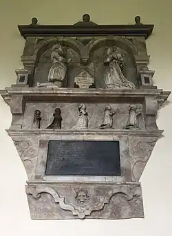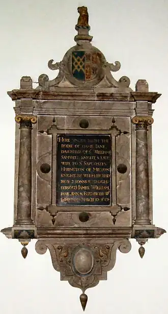 Holy Cross Church in Milton Malsor contains a monument on the south wall of the chancel to Harrington's mother, Dame Jane Harrington.[4] According to the memorial, she died on 30 March 1619, when James was 7 or 8 years old. The memorial reads, in modern English but punctuated as in the original: