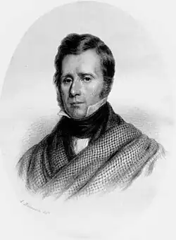 James Hogg was born on a small farm near Ettrick, Selkirkshire, Scotland in 1770 and was baptised there on 9 December, his actual date of birth having never been recorded.[1][2] His father, Robert Hogg (1729–1820), was a tenant farmer while his mother, Margaret Hogg (née Laidlaw) (1730–1813), was noted for collecting native Scottish ballads.[1][3] Margaret Laidlaw's father, known as Will o' Phawhope, was said to have been the last man in the Border country to speak with the fairies.[4] James was the second eldest of four brothers, his siblings being William, David, and Robert (from eldest to youngest).[5] Robert and David later emigrated to the United States, while James and William remained in Scotland for their entire lives.[5]