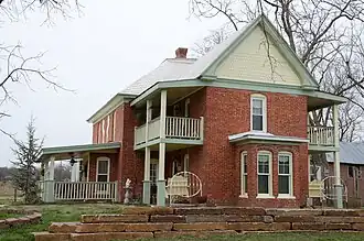 The James House is a historic house on Benton County Route 51 (S. Rainbow Road), between Osage Creek and Sunbridge Lane outside Rogers, Arkansas. Built c. 1903, the house is a high-quality brick version of a locally distinctive architectural style known as a "Prow house". It is an American Foursquare two-story structure with a truncated pyramidal roof, with a gable-roofed section that projects forward, giving the house a T shape with the stem facing forward. The property also includes a combination smokehouse-root cellar, also built of brick, which appears to date to the same period, and is unique within the county.[2]