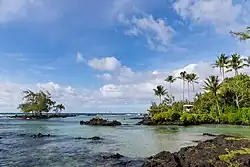 Located offshore is Scout Island, known locally as Mahikea Island.[3] The original name of Mahikea Island is Peiwe (a corruption of the 'Olelo Hawai'i spelling of 'Pe'ewe'). This name refers to the drupe shells, whose snails were commonly eaten and found throughout the Hawaiian Islands in shallow, rocky areas. The island was hit by the tsunami in 1946, which shortened it on its makai (seaward) end. It used to be a popular summer camping site among the residents of Keaukaha, as well as a destination for the Big Island boy scouts (hence its English name “Scout Island”).[4]