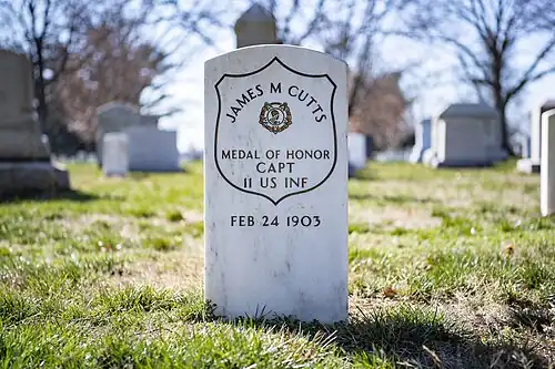 Cutts displayed gallantry at the Battle of the Wilderness, the Battle of Spotsylvania and the Second Battle of Petersburg between May 5 and June 18, 1864.[5] He received the Medal of Honor for these actions on May 2, 1891.[5] Claims that Cutts received a "triple" Medal of Honor are not accurate; he received a single award that cited his combined heroism in three separate battles.[5][a]
