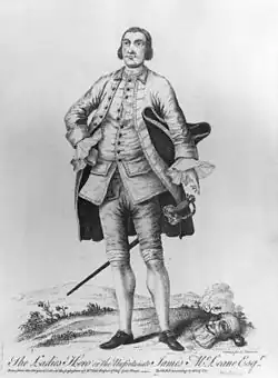 The thieves were often restrained and courteous, earning Maclaine the sobriquet "The Gentleman Highwayman". Living in St James's Street (next door to White's), he was now passing himself off as an Irish gentleman worth £700 a year, and he and Plunkett (who had lodgings in Jermyn Street) were said to be well-known figures about St James's.[18] Maclaine kept company with some noted "Ladies of the Town", and also with certain "Women of Fortune and Reputation" who were so unguarded as to admit him to their society.[11] He worked his way into the affections of a Lady who deserved better, but she was saved from ruin when a gentleman revealed to her Maclaine's character. He had a sufficiently low opinion of Maclaine's respectability that he was able to decline the duel which Maclaine consequently offered him.[11] This may have been a different challenge to that which Maclaine offered to a British officer at Putney Bowling Green in the spring of 1750. The officer, who had disparaged him, declined to fight him until he should give proof of his respectable origins.[22][23] Maclaine had recently obtained a certificate attesting to his descent from the nobility.[24]