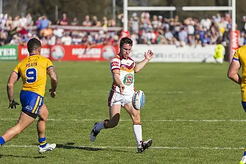 In Round 1 of the 2013 NRL season, Maloney made his club debut for the Sydney Roosters against the South Sydney Rabbitohs, scoring a try and kicking a goal in the 28–10 loss at Sydney Football Stadium.[17] On 21 April 2013, Maloney played for Country Origin against City Origin, playing at five-eighth in the 18–12 win at Coffs Harbour.[18] On 5 June 2013, Maloney made his State of Origin debut for New South Wales against Queensland in Game 1 of the series alongside his Roosters halves partner Mitchell Pearce, playing at five-eighth and kicking 3 goals in the 14–6 win at ANZ Stadium.[19][20] Maloney played in all 3 matches in the 2013 State of Origin series for the Blues in their 2–1 series loss. In Round 25 against the Gold Coast Titans, Maloney played his 100th NRL career match in the 30–22 loss at Sydney Football Stadium.[21][22] In Round 26 against the South Sydney Rabbitohs, the Roosters won the minor premiership with Maloney playing a key role by scoring 2 tries and kicking 4 goals in their triumphant 24–12 at ANZ Stadium.[23] On 6 October 2013, Maloney starred for the Roosters in the 2013 NRL Grand Final against the Manly Sea Eagles, setting up two tries with the boot, and kicking 5 goals in the 26–18 victory and winning his maiden NRL title.[24][25] Maloney was the NRL's top points scorer for the 2013 NRL season with 252 points, by scoring 9 tries and kicking 108 goals in 25 matches for the Roosters.