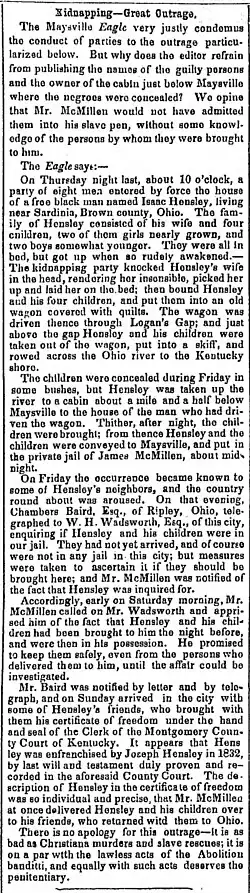 McMillen was notified of the fact that Hensley was inquired for. Accordingly, early on Saturday morning, Mr. McMillen called on Mr. Wadsworth and apprised him of the fact that Hensley and his children had been brought to him the night before, and were then in his possession. He promised to keep them safely, even from the persons who delivered them to him, until the affair could be investigated. Mr. Baird was notified by letter and by telegraph, and on Sunday arrived in the city with some of Hensley's friends, who brought with them his certificate of freedom under the hand and seal of the Clerk of the Montgomery County Court of Kentucky. It appears that Hensley was enfranchised by Joseph Hensley in 1832, by last will and testament duly proven and recorded in the aforesaid County Court. The description of Hensley in the certificate of freedom was so individual and precise, that Mr. McMillen at once delivered Hensley and his children over to his friends, who returned with them to Ohio.[8]
