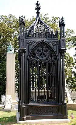 The James Monroe Tomb is the burial place of U.S. President James Monroe in Hollywood Cemetery, Richmond, Virginia, United States. The principal feature of the tomb is an architecturally unusual cast iron cage, designed by Albert Lybrock and installed in 1859 after Monroe's body was moved from Marble Cemetery in New York City. The tomb was declared a National Historic Landmark in 1971 for its unique architecture.[3][4] To Richmonders it is colloquially known as The Birdcage.