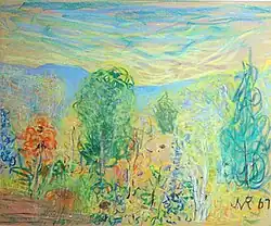 When Rosenberg retired from his law practice in 1947, he began a practice of donating works from his collection and proceeds from exhibition sales to charitable causes. In that year, he was given a solo exhibition at the Wildenstein Galleries. Howard Devree, a critic for the New York Times, who had briefly criticized Rosenberg's 1943 exhibition as "earnest" but "not very impressive," gave this show a long and quite favorable review.[87] He noted that some of the paintings had been loaned by private collectors and others by prominent museums, including the Boston Museum of Fine Arts, and that W. G. Constable of the Boston Museum had written the foreword to the accompanying catalog. Devree said "Mr. Rosenberg's painting is never pretentious or sensational. The play of light, the fleeting mood of a landscape, always such challenges to the artist, he strives to capture simply—not by literal transcription but with a warmly understanding interpretation."[88] On passing the age of 80 in 1954 he continued to paint and exhibit, including a show of work made during the trip he made to Israel to meet with Ben Gurion and others.[89][90] Regarding one of these shows, a New York Times critic, Stuart Preston, praised the emotional power of his mountain landscapes and his landscapes showing the devastation that he imagined would result from atomic war, but he was less enthusiastic about their artistic value.[note 15] He wrote, "The very humanity of Rosenberg's feelings goes far to excuse the esthetic shortcomings of the paintings."[92]