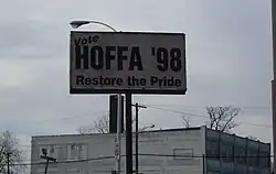 On February 20, 2008, Hoffa became the first major union leader to endorse Democratic senator Barack Obama in his bid to become president of the United States.[53] Hoffa campaigned in major states for Obama throughout the primary and general election. He served as a superdelegate to the 2008 Democratic National Convention[53] in Denver and a member of the Michigan Electoral College.[54][55]