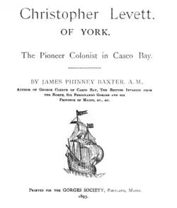 Baxter also devoted several years to unearthing the details of Capt. Christopher Levett's settlement at Portland in 1623–1624. An English sea captain and explorer, Levett's history and the details of the colony he attempted to found had been largely forgotten when Baxter's scholarship illuminated them. Baxter later published a book about Levett, which incorporated the text of Levett's own earlier work, published in 1628 in London.[5]