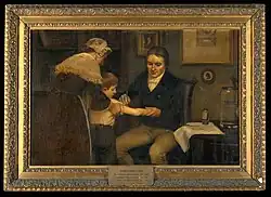On 14 May 1796 he was selected by Jenner, who took "a healthy boy, about eight years old for the purpose of inoculation for the Cow Pox".[4] Jenner took some fluid from the cowpox vesicles on the hand of a milkmaid named Sarah Nelmes (in an unpublished manuscript Jenner refers to her as Lucy Nelmes[5]), and inoculated Phipps by two small cuts in the skin of the boy's arm.