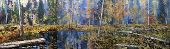 Cook paints quickly, attacking the linen surface with bold lines and richly colored bursts of thick paint applied with brushes and trowels, often dragging tools through the wet paint to create crevices and lines.[6][1][33] Up close, images such as Equinox 09 #1 (2011) or Whisper #2 break down into small strokes of color and complex, textural, almost sculptural surfaces; from afar they coalesce into recognizable, often realistic images whose power and energy matches the majestic, natural physicality being depicted.[16][2][34][25] However, Cook is equally enthralled by man-made environments, as in works like Morgan's Point, which often seem to allude to both the power and awe of industry and the costs.[11][6][4][14] Writers such as curator Stephen Vollmer note that, like Turner (and Monet), Cook is especially captivated by light and atmospheric effects, capturing the ephemerality of skies dissolving into billowing clouds, rushing water (e.g., Blue River Cascade[35]), smoke, and reflections of trees or fire on water (e.g., Lake Charles #2[36]).[27][37][30][32] Cook has said, simply, "I love visual beauty [...] I am convinced that is the most important thing I can do, to make my pictures as wonderful to look at as they can be."[38][12]