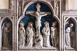 Among his works are 60 statues on the west front of Salisbury Cathedral; the statues of the Apostles at Ely; groups of figures on the reredos and statues of saints in the south porch at Gloucester Cathedral;[4] Our Lord in majesty in the chapter-house at Westminster; an elaborate reredos, representing the crucifixion, with the martyrdoms of St. Peter and St. Andrew, in St. Andrew's Church, Wells Street; the entombment in the Digby mortuary chapel, Sherborne; and Expulsion from Eden at St Leonard's Church, Bridgnorth in Shropshire.[5]