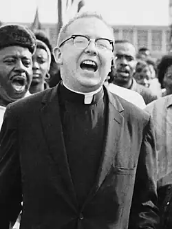 Beginning in his new ministry, Reeb encouraged parishioners to participate in the movement as well. With his wife and four children, he lived in poor black neighborhoods where he felt he could do the best.[9] He took a job that would allow him to work closely with Philadelphia's poor community as a youth director for the West Branch YMCA between 1957 and 1959. While at the YMCA he abolished the racial quota system and started an integrated busing program to transport youth to and from the location. When he was granted a preliminary fellowship by the Unitarians, he accepted an offer to be an assistant minister of All Souls Church in Washington D.C. After three years of active service at All Souls Church, Reeb was fully ordained as a Unitarian Universalist minister in 1962.[10] In 1964, he began as community relations director for the American Friends Service Committee's Boston Metropolitan Housing Program, focusing on desegregation.[9] At the AFSC, Reeb and his staff advocated for the poor and pressed the city to enforce its housing code, protecting the rights of tenants of all races and backgrounds, particularly poor African and Hispanic Americans. The Reebs were one of the few white families living in Roxbury. James Reeb's daughter Anne recollected that her father "was adamant that you could not make a difference for African-Americans while living comfortably in a white community."