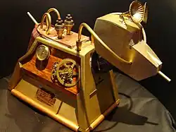 Using a mixture of found, hand crafted and raw materials, Brown creates objects that heavily draw on and in turn influence steampunk, science fiction, dieselpunk, alternative history and neo-Victorian styles. These works include devices, weapons, tools and ornamentation featured in his publications and working examples of modern technology such as mobiles phones, USB sticks, speakers and DVD players re-imagined in the steampunk aesthetic. Many of these works are released under the 'Sydeian Creations' collection with some of the darker work which more closely adheres to the steamgoth aesthetic released as part of the 'Black Laboratory'. His work has appeared in Museum of the History of Science, Oxford,[3][4] the Hartford Artspace gallery,[5] Chepstow castle,[6] Bradford Industrial Museum and the British Library,[7] as film props and within articles on steampunk both on and off the internet.