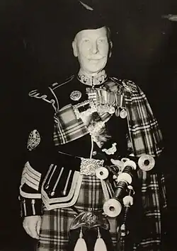 As Pipe Major he trained and sent three bands overseas during the First World War, and during the Second World War he trained the first band to land in Europe.[4]