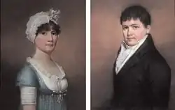 Before marrying Ellen Wallace, James had been active in Bristol, Liverpool, and Bath, where he taught drawing.[5] The family left for the United States in 1796, but, according to Ellen's diaries, their ship fell into the hands of the French, and for seven months the family spent time in Brest, near Cherbourg. Landing in New York, James quickly became popular for his small portraits in pastel and his miniatures.[6] From 1796 to 1801 he worked mainly in Philadelphia and New York, securing portrait commissions. The family traveled throughout New England region as itinerant portrait painters, looking for work and making inexpensive copies from the originals portraits they had made of popular and well-known figures, such as George Washington and James Madison.