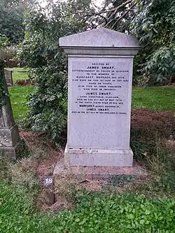 Smart's health began declining in the late 1860s.[13] In the middle of 1869, he was diagnosed with a "cancerous condition of the stomach” and his health had deteriorated to the point that Alexander McCall, superintendent of Glasgow's Central Division, had to deputise in his absence.[13] Smart did not recover from his condition and died in his home at Canning Place, Glasgow, on 27 May 1870 at the age of 66.[3] His wife had pre-deceased him, but he was survived by a son and four daughters.[13] He was buried at the Southern Necropolis in Glasgow.[1] His protégé McCall was the favoured candidate to succeed him described in the same report as Smart's funeral as being an intelligent and polite young man with "plenty of vigour and resources as has more than once been shown by the way he has handled notorious criminal cases".[3] The police authority concurred with this view and appointed McCall as Glasgow's Chief Constable with him serving in the position until his own death on 29 March 1888.[14]