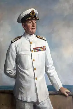 Somerville was placed in charge of the British naval delegation in Washington, D.C. in October 1944 where he managed—to the surprise of almost everyone—to get on very well with the notoriously abrasive and anti-British Admiral Ernest King, the United States' Chief of Naval Operations.[22] He became Deputy Lieutenant of Somerset on 8 November 1944,[28] was promoted to Admiral of the Fleet on 8 May 1945 and was advanced to Knight Grand Cross of the Order of the British Empire on 1 January 1946.[29] He was also appointed a Knight Grand Cross of the Order of Orange-Nassau by the Netherlands government and a Commander of the Legion of Merit by the United States.[30]