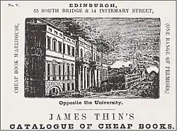 Trade continued to improve and Thin was soon advertising the business as "the largest retail bookselling establishment in Edinburgh".[5] In 1854, he issued his first catalogue of second-hand books.[4] In 1864, the shop was extended into 15 Infirmary Street, a former tavern.[4]: 6–7