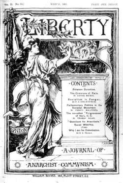 In January 1894 Tochatti started the anarchist monthly newspaper Liberty: A Journal of Anarchist Communism[11] in response to the violent rhetoric being used in the newspaper Commonweal. Liberty was to be avowedly against political violence and "bombastic talk", with Tochatti arguing that it only served to alienate people from the anarchist cause.[7] Tochatti produced the periodical in the book-lined basement of his shop on Beadon Road in Hammersmith, London, with help from regular contributor Louisa Sarah Bevington.[12][7] Though the paper was explicitly anarcho-communist it facilitated conversation between anarchists and anti-parliamentary socialists following the split of the Socialist League.[7] In December 1896 he announced that he was suspending publication of the paper due to ill health, though finances were likely also a contributing factor.[2][7]