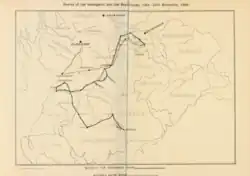 While these things were transacting in Dumfries, the insurgents and their sympathisers kept up a correspondence by special messengers, and continued deliberating on what was best to be done. Among others, Wallace joined a consultation, which was held at the chambers of Mr. Alexander Robertson in Edinburgh, the same night that Sir James Turner was made prisoner. At this meeting it was resolved to make common cause with the western brethren, and seek redress from government with arms in their hands. Colonel Wallace and a little band of adherents lost no time in proceeding to Ayrshire, in the hope of being reinforced there. They joined the main party on Wednesday 21 November at Brig o' Doon, where he was given military command.[12][8][2] They visited successively Mauchline, Ayr, Ochiltree, Cumnock, Muirkirk, and other places on the route; but met with little encouragement in their enterprise. Mr. Robertson, who had been still less successful in procuring assistance, rejoined Wallace, along with Captain Robert Lockhart, and insisted that the undertaking should be abandoned. This counsel was unpalatable to Wallace, but he forthwith sent Maxwell of Monreith to consult with John Guthrie, brother to the celebrated minister of Fenwick, on the subject. Having been reinforced by a small party from Cunningham, under Captain Arnot, the whole body marched to Douglas on Saturday the 24, where at night, after solemn prayer, the proposal of Robertson and Lockhart was carefully considered. It was rejected without one dissenting voice, all being clear that they had a divine warrant for the course they were pursuing. They resolved, therefore, to persevere in it, although they should die at the end of it; hoping that, at least, their testimony would not be given in vain to the cause they had espoused. Two other questions were discussed at this meeting: the renewing of the covenants — to which all agreed; and what should be done with Sir James Turner, whom, for want of any place in which to confine him, they still carried about with them; and who, as a persecutor and murderer of God's people, it was contended by many, ought to have been put to death. As quarter, however, it was alleged, had been granted to him, and as he had been spared so long, "the motion for pistolling him was slighted."[10][8]