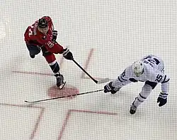 Van Riemsdyk began the 2013–14 season on a line with Bozak and Kessel, a trio that provided an early offensive boost to the Maple Leafs. In his first eight games, van Riemsdyk alone scored eight points.[47] On March 29, 2014, van Riemsdyk tied the NHL record for the fastest goal from the start of a period, scoring against Steve Mason of the Flyers four seconds into the second period. He joined Claude Provost in 1957 and Denis Savard of 1986 as the third player to accomplish the feat.[48] This was also the first season that van Riemsdyk scored 30 or more goals during his NHL career. The milestone came on April 3, 2014, in a 4–3 overtime victory over the Bruins.[49] Although an eight-game losing streak at the end of the season caused the Leafs to miss the playoffs,[50] Van Riemsdyk posted the best season of his career, with 30 goals and 30 assists in 80 games.[51]