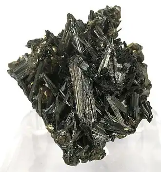 Jamesonite (also axotomous antimony glance,[2]: 501 domingite, comuccite, pfaffite, grey antimony or feather ore)[3]: 24 is a sulphosalt mineral, a lead, iron, antimony sulphide with formula Pb4FeSb6S14. With the addition of manganese it forms a series with benavidesite.[4] It is a dark grey metallic mineral which forms acicular prismatic monoclinic crystals. It is soft with a Mohs hardness of 2.5 and has a specific gravity of 5.5 – 5.6.[5] It is one of the few sulphide minerals to form fibrous or needle like crystals. It can also form large prismatic crystals similar to stibnite with which it can be associated. It is usually found in low to moderate temperature hydrothermal deposits.[4]