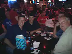![]() Newberg, second to left, with then Texas Rangers owner Chuck Greenberg, front left, and stadium announcer Chuck Morgan, far right, at a Newberg watching party | |