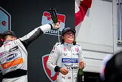 In October 2023, it was announced that Chadwick would return to Andretti Global (formerly Andretti Autosport) for the 2024 Indy NXT season.[63] She showed immediate improvement from the previous season, qualifying 10th for the first race and inside the top 6 in the next 4 races.[64] Chadwick fought in the front of the pack for the first races, but contact and mechanical issues meant she didn't achieve results representative of her pace.[65] Chadwick scored her best result to date in race 3 at the Indianapolis Motor Speedway, finishing on the podium in third place. She became the first woman to finish on the podium in Indy NXT since Pippa Mann in 2010.[66] In race 6 at Road America she took a lights to flag victory, to convert her maiden pole position to a maiden win, becoming the first woman to win in Indy NXT/Indy Lights since Pippa Mann in 2010. She also became the first woman in series history to claim a road course pole and road course win.[67]