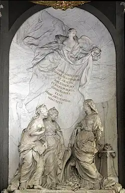 While working early in his career on projects of Daniel Marot, his style shows similarities with that of Marot.[11] Even in his early career he showed an interest in developing his own style as shown in the Group of three children, allegory of Summer of 1726 (Rijksmuseum, Amsterdam). It shows a lively group of two nude girls and a boy children holding symbols of summer (corn stalks, ears of corn, a sickle) who are connected through scanty draperies. The group shows his interest in achieving a lively interaction between the children and a nice distribution of their attributes.[7] His knowledge of the new Rococo style is demonstrated in the decoration of the old The Hague City Hall, in particular in the marble overdoors for the central hall, which are in the form of rocailles, a typical decorative element used in the Rococo style. Executed in 1634, this may be the earliest use of rococo architectural elements in the Dutch Republic. His later style became more elaborate, as is seen in works such as the Allegory of Faith of 1735–9, in the Grote Kerk of Haarlem.[11] His style remained generally closer to Classicism then Rococo, which was likely related to the fact that most of his commissions were made for aristocratic residences or funeral monuments.